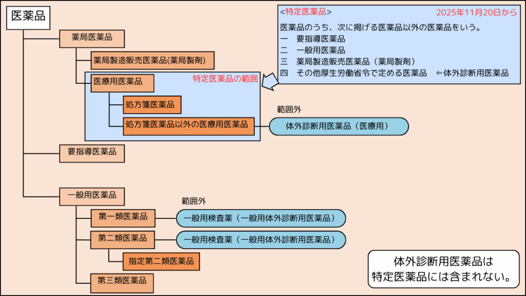 体外診断用医薬品は、医薬品の区分のうち「薬局医薬品」または「一般用医薬品」に区分されます。
